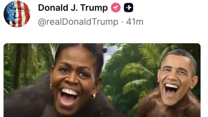 United States President Donald Trump has posted an artificial intelligence–generated video depicting former President Barack Obama and former First Lady Michelle Obama as monkeys.